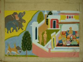 | Description / विवरण | Miniature painting based on Ramayana depicting Hanuman and Ram outside a palace and Sugriv is sitting in palace with vanars. It is an incomplete painting. |