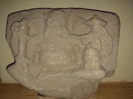 | Description / विवरण | An independent sculpture of four armed Ganesh sitting in lalitasana . Attributes from the right below- I - cannot be identified, II- holding an axe, III- cannot be identified rubbed out , IV- bowl of sweets. He is wearing a crown, necklace armlets, bracelets, waistband and anklets. A snake is seen over the chest. The face and the right foot are chopped off. |