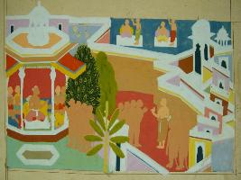 | Description / विवरण | Miniature painting based on Ramayana depicting Sugriv s court and his monkey army getting prepared for war with Ravan. In the background trees and many buildings are also depicted. It is an incomplete painting. |
