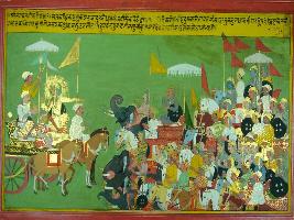 | Description / विवरण | Miniature painting based on Shri Bhagwat Gita. Sanjay telling Dhritrashtra that Duryodhan is seeing Pandavas Sena and their warrior-Dhritdyumna commander , Arjun, king Virat, king Dhrupad with 5 Draupadi s son and Abhimanyu, Nakul and Sahdev are shown standing with their army, waiting for war to start. |