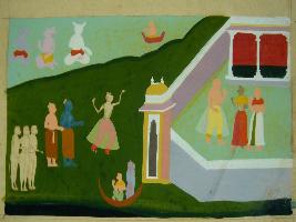 | Description / विवरण | An incomplete miniature painting depicting scene of Ramayana. At the left side Ram, Lakshman with monkey army are depicted and Hanuman flying to Lanka in search of Sita. On the upper right side three demons are depicted. At the left side Hanuman is shown meeting Sita. |