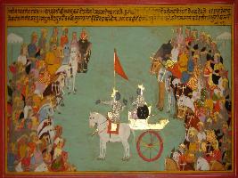 | Description / विवरण | Miniature painting based on Mahabharat depicting scenes from Shri Bhagwad Gita. Arjun told Krishna to take his chariot in the mid of the two armies, Krishna took the chariot in the mid of two army, and when he saw Bhishma pitamah, his guru, guru s son, brothers sons and grandsons in the field Arjuna threw the Gandiv and told Krishna that after killing his kinsmen, he does not need the Kingdom, what will he do with it without them. |