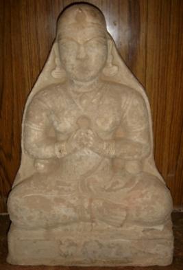 | Description / विवरण | Independent image of a seated female, probably a devotee. She is in padmasana and holding flower with both hands. She is well ornamented with necklace, earrings, armlets and bangles. An animal is depicted on the pedestal. |