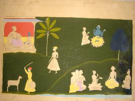 | Description / विवरण | An incomplete miniature painting depicting on the upper right Krishna and Vasudev talking to each other. At the upper left side, a Brahman is worshipping Vishnu. At the lower right a man is killing a goat. In the other side, Sukhdev is talking to Parikshit and sages are depicted. |