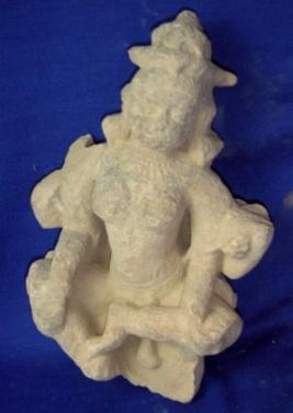 | Description / विवरण | Four armed seated female deity-upper two arms are broken, lower right hand on thigh and holding pitcher in the left hand. |