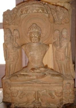 | Description / विवरण | Independent sculpture of Jain Tirathankara Shantinath sitting in Padmasana under a canopy on a pedestal, flanked by two female chauri bearers on the sides and garland bearers on the top. His hands are chopped off. Below the pedestal two mythical lions are depicted. |