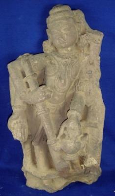 | Description / विवरण | An independent image of 4 armed Shiva in standing position. Attributes from right below are i Akshamala ii Trident tip broken iii missing iv pitcher. His feet are missing and he is duly ornamented. |