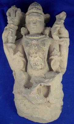 | Description / विवरण | Independent sculpture of four armed Shiva seated in Lalitasana. Attributes from right below. i broken, ii Trident, iii snake, iv broken. He is wearing Jata mukuta and feet are broken. |