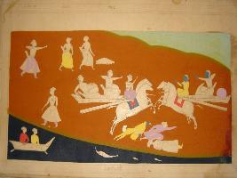 | Description / विवरण | Miniature painting based on Mahabharat - fight between Arjun and Bhishma. Krishna is driving Arjun s chariot. Many other men are shown. It is an incomplete painting. |