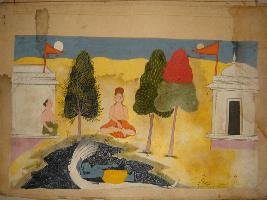 | Description / विवरण | An incomplete miniature painting depicting Sheshshyayi Vishnu being worshipped by a yogi. At the upper right side, a Brahman is depicted. At the left side, a temple is seen. |