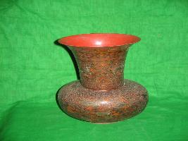 | Description / विवरण | It is a brass lacquer vase with koft work. It carries floral and animal motifs. It is red from inside. |