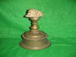 | Description / विवरण | This is a brass bell Ghanta . On the top of bell a sculpture of ox is carved with high ornamentation sitting on a pedestal. Some inscription is incised on the lower portion of the bell. |
