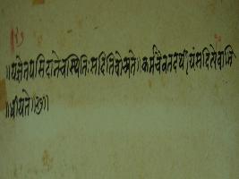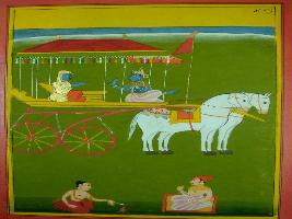 | Description / विवरण | Miniature painting based on Shri Bhagwat Gita. It depicts Krishna preaching Krishna in the lower part of the painting depicting Brahman is performing penance and king is sitting in front of him. |