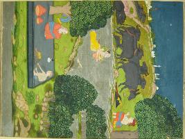| Description / विवरण | Miniature painting based on Sohni Mahiwal depicting Sohni swimming in a river and Mahiwal is seen seated under a tree and playing flute, waiting for her. |