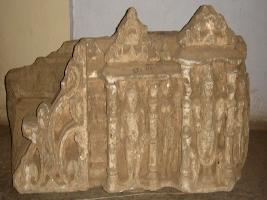 | Description / विवरण | A sculptured architectural fragment panel depicting from right end, lord Brahma has been depicted with head gear, 2 hands depicting of a lady next to nayaka is depiction of Surya two handed with holes in both hands, and at left end is depiction of another two handed woman- probably Nayika. |