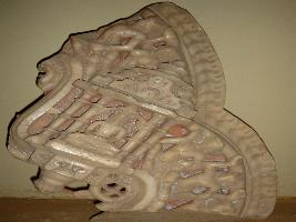 | Description / विवरण | A sculptured architectural fragment of a Toran gateway . In the centre of the fragment is a seated Jaina Tirathankara in Dhayana mudra flanked by pillars two on each side. The face of the image is defaced. On the upper part at right side has flying couple and lower part at left three male flying figures are carved. |