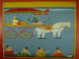 | Description / विवरण | Miniature painting based on Shri Bhagwat Gita. It depicts Krishna preaching Arjun, it also depicts in the lower part of the painting four sages sitting one is preaching to another one, one is reading and one is meditating before fire. |