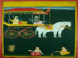| Description / विवरण | Miniature painting based on Shri Bhagwat Gita. It depicts Krishna preaching Arjun in the lower part of the painting it depicts one Brahman sitting and another Brahman is performing yagna. |