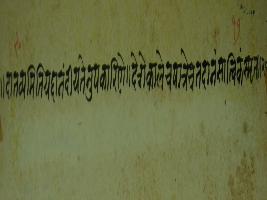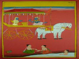 | Description / विवरण | Miniature painting based on Shri Bhagwat Gita. It depicts Krishna preaching Arjun, it also depicts in the lower part of the painting depicts two Brahmans are sitting on the bank of the river one is giving something to another and another Brahmans is taking deep in water, in one corner of the painting appeared Rahu. |