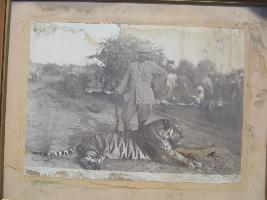 | Description / विवरण | It is a black and white photograph of M. Ganga Singh ji with tiger.He is wearing a sikar dress. Background has some person. |