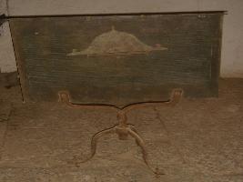 | Description / विवरण | An astrological yantra made by Narayan Das kept on an iron stand. It has three legs, the main plate is made of metal and some numbers in Hindi are written. |