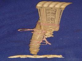 | Description / विवरण | Back scratcher made of ivory broken in to three pieces. On the top five fingers are carved to scratch the back. Below it peacocks and flowers are carved with jali design. The whole stick is carved with bird and floral motives. |