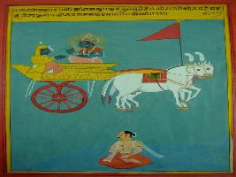 | Description / विवरण | Miniature painting based on Shri Bhagwat Gita. It depicts Arjun asking Krishna to show true and most powerful soul and form of his own. |