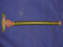 | Description / विवरण | Back scratcher with long, wooden stick painted with black colour having golden coloured floral designs. On the top of it an ivory sunflower is carved with leaves and bud. |