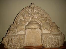 | Description / विवरण | A sculptured architectural fragment of Jain Parikar depicting celestial figure Gandharvas , two female deities are depicted on both corner of the Parikar, a halo is visible at the centre. |