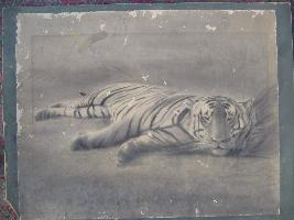| Description / विवरण | It is black and white photo of a lying tiger . |