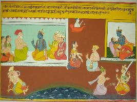 | Description / विवरण | Miniature painting based on Velli Krishna Rukmani depicting Vasudev with Krishna, Rukmani and Krishna in a loving union, an amorous couple, Pradyuman and Aniruddh, a devotee worshipping Lakshmi. |