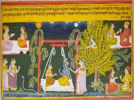 | Description / विवरण | Miniature painting based on Velli Krishna Rukmani. In the centre Krishna is depicted with Rukmani sitting on a swing. In three corners three couples are depicted and in one corner two women are depicted with a snake. |