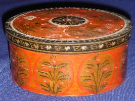 | Description / विवरण | Wooden container, cylindrical in shape with painted outer surface while the inner surface is plain. It has a lid that too painted with floral motifs in lacquer paint. |