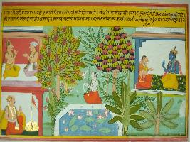 | Description / विवरण | Miniature painting based on Velli Krishna Rukmani depicting Kamdev sitting near a pond with lotus blooms in the centre of the painting, in the right part, two men are seated and a king is sitting in the lower part. In the left side of the painting Krishna and Rukmani are depicted. |