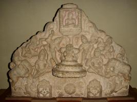 | Description / विवरण | An upper part of a parikar at the centre of which, the deity is missing. The centre is engraved with a lotus medallion flanked by two Srivatsa symbol at both sides. The canopy is round in shape at the top of which a figure is engraved which is completely mutilated. At the top of the canopy on both sides flying male gandharvas with musical instruments are depicted. Above them two female figures are seen face of which are defaced. At the extreme left and right end two elephants are seen with elephant rider. At the top centre one Jaina Tirathankara is seen in Dhyanamudra. |