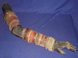 | Description / विवरण | Nineteen lacquer bangles, four metal and two glass bangles having beautiful design on outer part of every bangle. These bangles are fixed in the left hand of a woman made of wood and painted with black colour while in the each finger of the hand is having a metallic ring of black colour. |