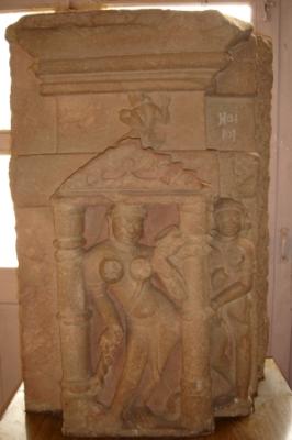 | Description / विवरण | Sculptured architectural fragment of a doorjamb, depicting a standing female. In pillared niche in Tribhanga pose. She is probably dwarpalika. Her left arm is raised upward holding a bowl and right hand holding a rope. Tussels of her drapery is visible upto her knee. She is flanked by a female attendant on left side and celestial figure on the top of the figure. |