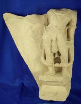 | Description / विवरण | Sculptured architectural fragment depicting a male deity in standing position. His right hand and head are missing while left hand is in Kartavyalambit mudra. He is wearing a banmala and adorned with jewels like necklace, armlet and bracelet. |