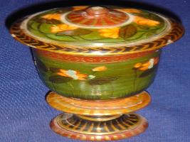 | Description / विवरण | Miniature wooden container with lid, painted with lacquer paint, has flat circular base, raising inward and body is cylindrical in shape. It is decorated with floral motifs and geometrical designs. Lid contains circular ridge on exterior with floral designs. |