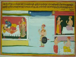 | Description / विवरण | Miniature painting based on Velli Krishna Rukmani depicting Krishna and Rukmani lying together in the room. A Nayak is standing holding a flower in his hands. At the left side, a female is standing in front of a man and a Pundit in front of another seated man. |
