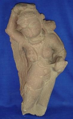 | Description / विवरण | Sculptured architectural fragment depicting a Surasundari in standing position with right hand raised upon head and left hand on waist. The legs are broken from knees. She is adorned with jewels. |