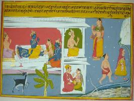 | Description / विवरण | Miniature painting based on Velli Krishna Rukmani depicting Krishna resting on his bed and Duryodhan seated on his head side and Arjun near his feet. Both of them are requesting Krishna s help in the Mahabharat war. |