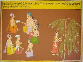 | Description / विवरण | Miniature painting based on Velli Krishna Rukmani depicting four Pundits with a noble in the upper right part, in the lower right part, two nobles are depicted with a Purohit in front of them. In the left part, a female is depicted under a tree. |