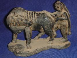 | Description / विवरण | Stone sculpture of woman herding a cow and standing behind it. They are standing on a pedestal. |