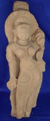 | Description / विवरण | An independent image of Surasundari in standing position. She is holding a lotus with left hand and with right hand holding the tussle of the garment. She is adorned with jewels. The legs are partly missing. |