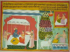 | Description / विवरण | Miniature painting based on Velli Krishna Rukmani. On one side Krishna is depicted sitting with Rukmani under a canopy and attended by two female attendants. On the other side a couple is depicted sitting on a bed. A priest is depicted blessing a disciple and a cow is also depicted. |