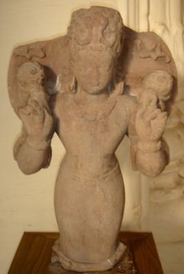 | Description / विवरण | Independent sculpture of Surya in standing position holding one lotus in each hand. His legs below knees are broken and face is rubbed off. He is having a mukuta and adorned with jewels. Part of two garland bearers are seen on the top on each side. |
