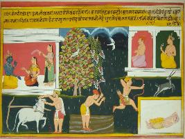 | Description / विवरण | Miniature painting based on Velli Krishna Rukmani. On one part Krishna and Rukmani are sitting. One man is putting a plough on cow, another man is digging the earth, a hunter is running after a deer, two men are sitting in a palace and a man is sleeping. |