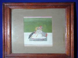 | Description / विवरण | Miniature painting depicting Hindu prince sitting on a couch, holding a sword with both hands and wearing royal costume. |