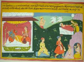 | Description / विवरण | Miniature painting based on Velli Krishna Rukmani depicting the dawn time, when Rukmani awaking Krishna and the sun started shining. At the top, pelican birds are chirping and a man blowing a Shankh . At the upper left side a lady is awaking her husband. |
